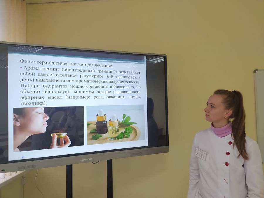 31 марта состоялось заседание профессионально-педагогического лектория. С докладом на тему «Лечение нарушений обоняния, ассоциированного с COVID-19» выступила преподаватель Касперович Надежда Анатольевна. Докладчик подробно рассказала о причинах возникновения и наиболее эффективных методах профилактики и лечения нарушений обоняния.