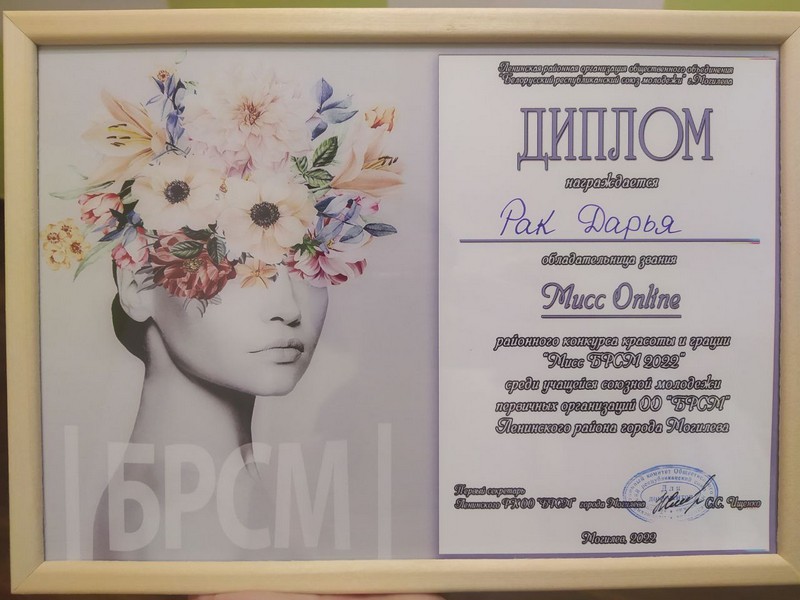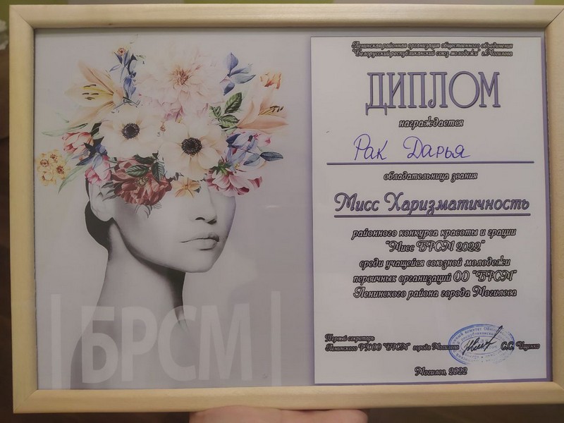 22 апреля 2022 года среди первичных организаций ОО «БРСМ» Ленинского района г. Могилева состоялся районный конкурс красоты и грации «Мисс БРСМ 2022». От Могилевского медицинского колледжа участницей конкурса стала активистка нашей «первички» Дарья Рак из группы 6Ф21.