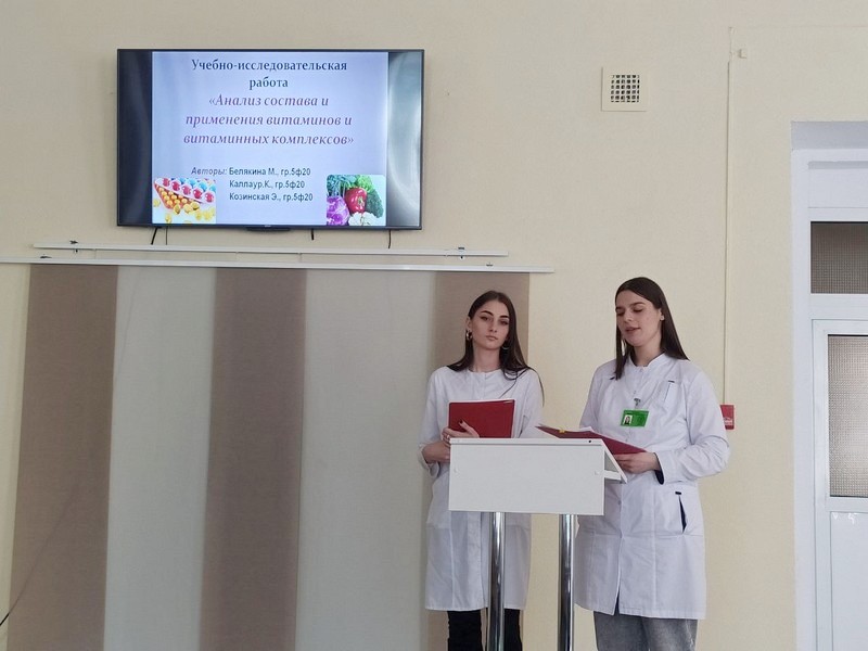 учащиеся группы 5Ф20 Белякина Маргарита, Каллаур Кристина и Козинская Эмма с работой «Анализ состава и применения витаминов и витаминных комплексов». Руководители – Чабанова В.С. и Шудрик Т.С.