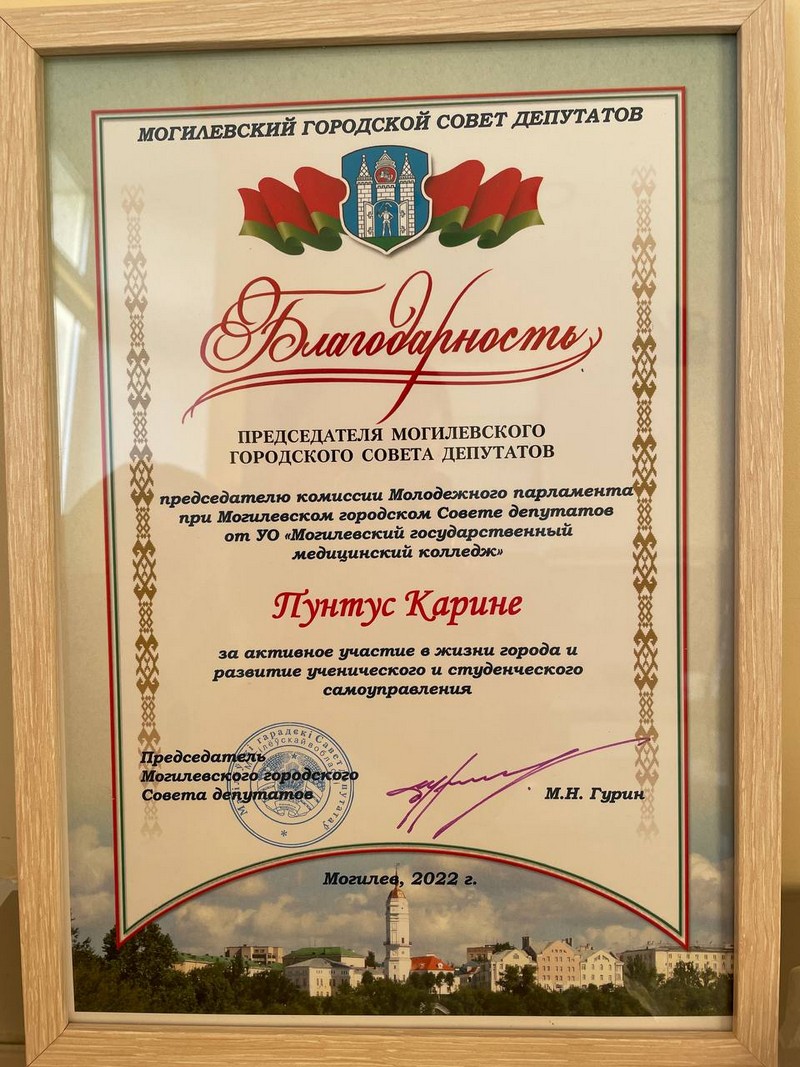 Учащаяся группы 4ф20 Пунтус Карина, так же как и другие выдающиеся ребята, получила благодарность за активное участие в жизни города и развитие ученического и студенческого самоуправления.