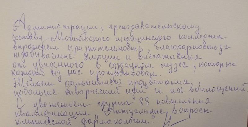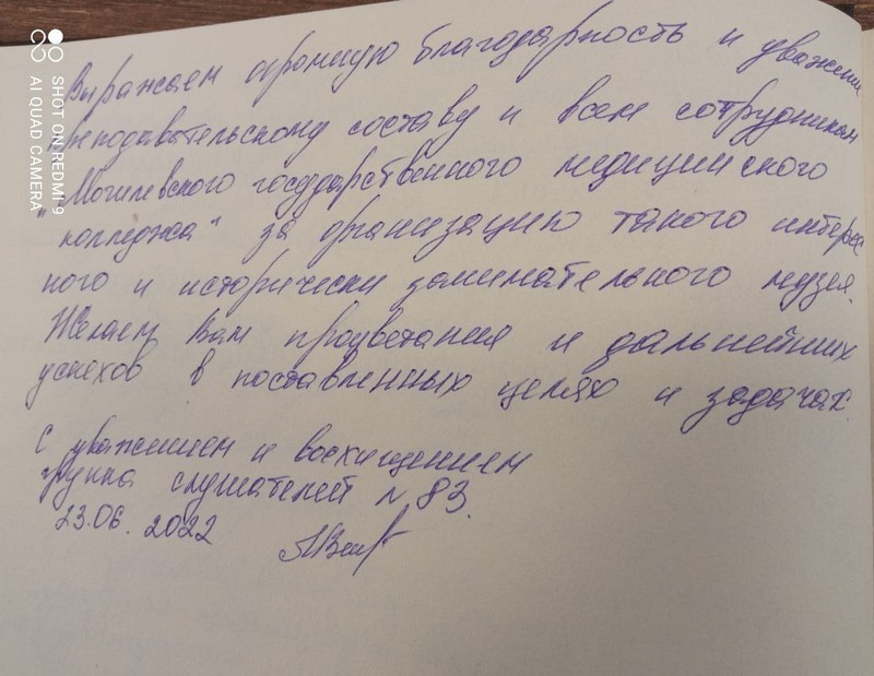 23.06.2022г. две группы слушателей отделения повышения квалификации и переподготовки Могилевского медицинского колледжа посетили музей колледжа. Медицинские работники различных организаций здравоохранения области с большим удовольствием побывали на экскурсии, с огромным интересом рассмотрели экспонаты и экспозиции, активно обменялись мнениями и впечатлениями об увиденном и услышанном, сделали фотографии на память и оставили письменные положительные отзывы в книге посетителей. Большинство слушателей ранее являлись выпускниками нашего колледжа и искренних чувств ностальгии, приятного удивления, добрых улыбок и удивленных глаз им было не скрыть. Положительные эмоции и неудержимый восторг всех слушателей вызвал нынешний обновленный облик колледжа и появление музея. Выпускникам есть чему удивляться и чем гордиться!