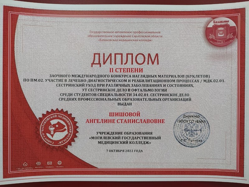 Учащиеся Могилевского медицинского колледжа приняли участие в заочном межрегиональном конкурсе наглядных материалов (буклетов) «Сестринский уход при различных заболеваниях и состояниях. Сестринское дело в офтальмологии», организованном ГАПОУ СО «Балаковский медицинский колледж», Российская Федерация. На конкурс было представлено 63 работы от учащихся учреждений образования Российской Федерации и Республики Беларусь. Наши ребята показали отличный результат: Шишова Ангелина – Диплом II степени (преподаватель Сенченко И.И.) Асадулаев Илья – Диплом III степени (преподаватель Пойда О.В.) Рещиков Дмитрий – Диплом III степени (преподаватель Парфенова Н.Н.) В конкурсе также приняли участие Перовская Валерия и Галушкин Владислав. Поздравляем наших участников и желаем дальнейших успехов и новых побед!