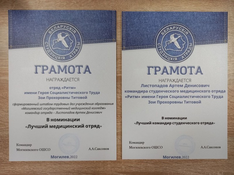 Студенческий медицинский отряд «Ритм» Могилевского медицинского колледжа одержал победу в номинации «Лучший медицинский отряд»! Командир этого отряда, Артём Листопадов, отмечен как лучший командир студенческого отряда! Завершилось мероприятие совместным исполнением гимна студенческих отрядов.