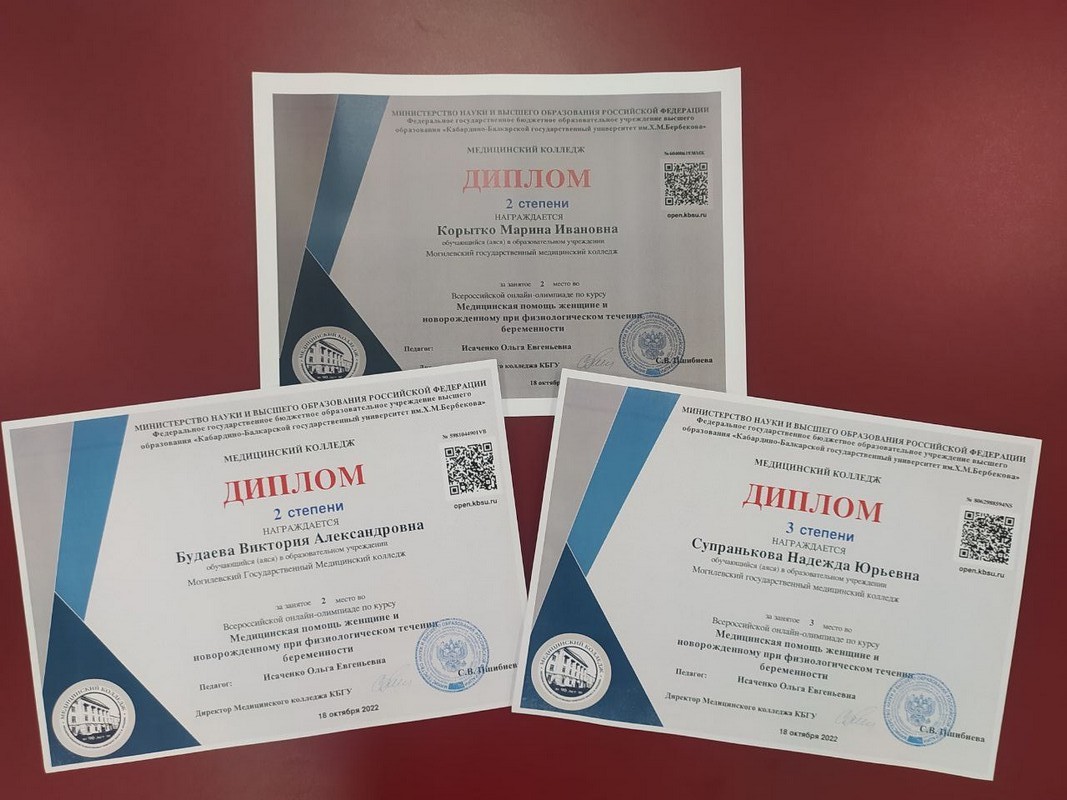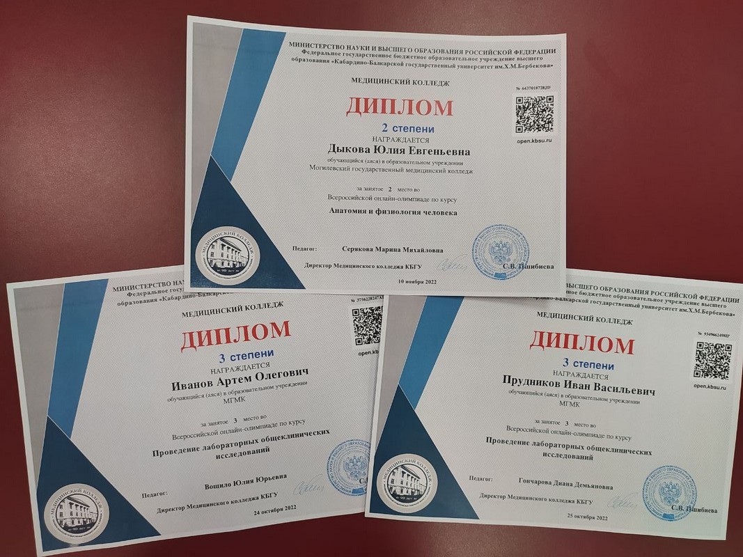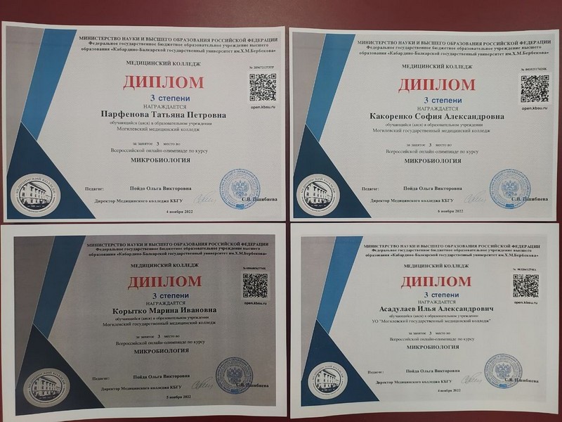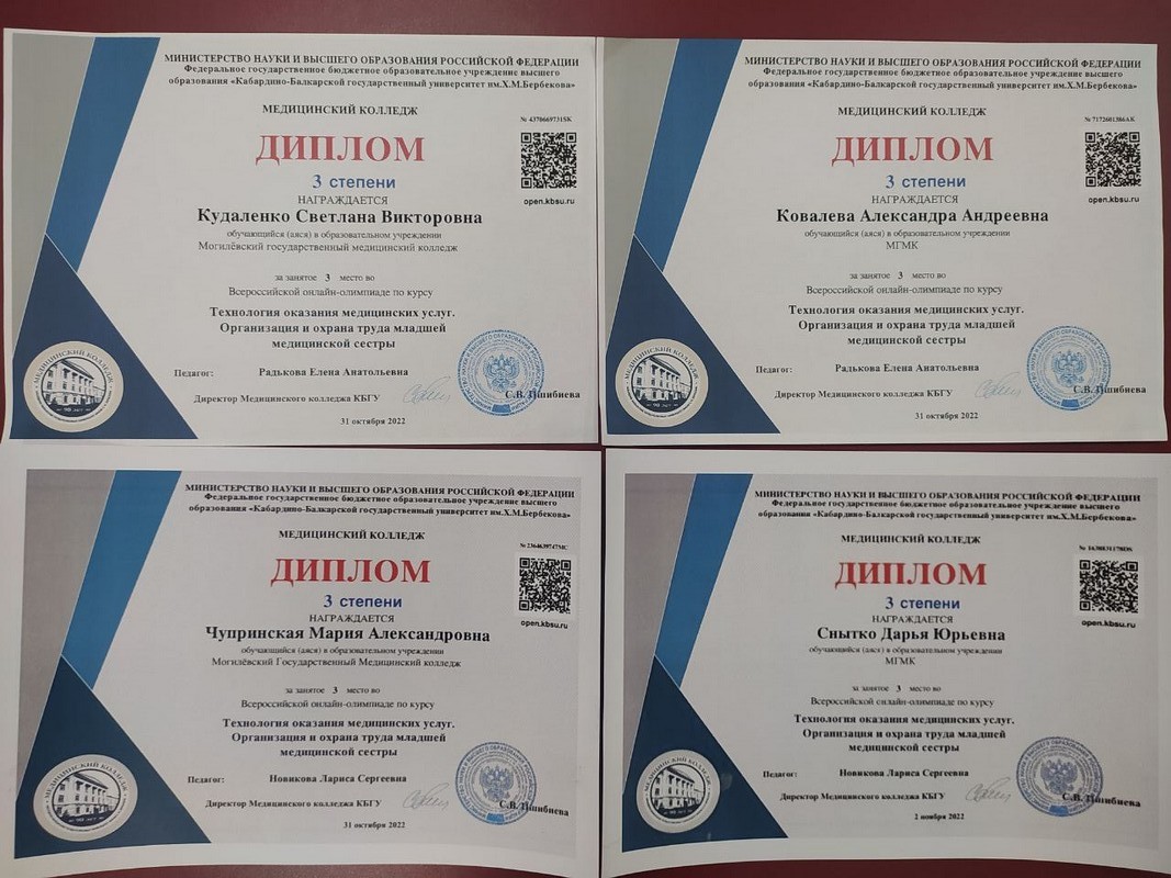 В октябре и ноябре 2022 года на базе Медицинского колледжа Кабардино-Балкарского государственного университета им. Х.М.Бербекова прошла осенняя сессия онлайн-олимпиад с международным участием среди студентов средних специальных медицинских профессиональных образовательных организаций. Мероприятие проводилось в рамках празднования 90-летия университета.