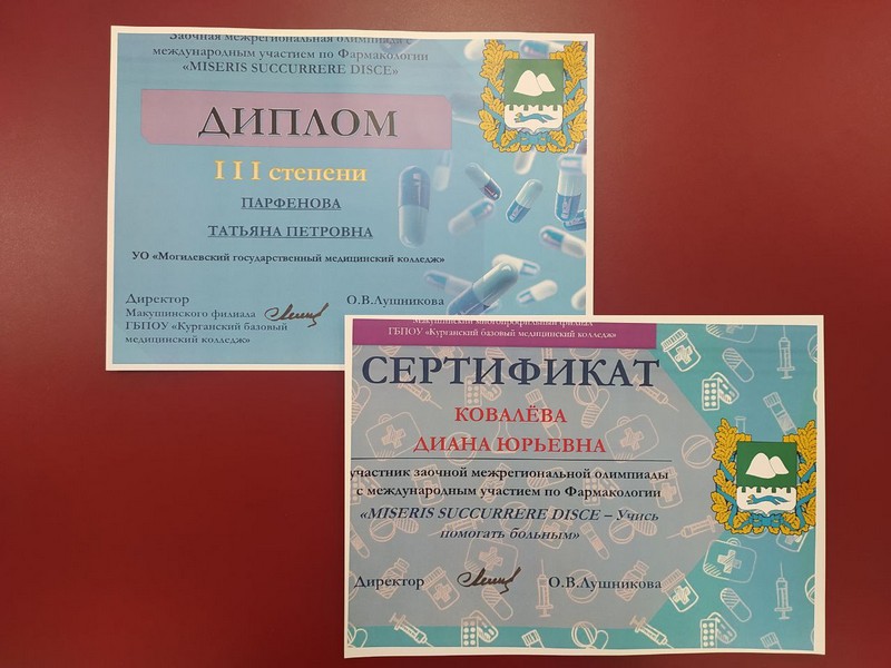 Учащиеся нашего колледжа Татьяна Парфёнова и Диана Ковалёва (группа 2ЛД21) приняли участие в заочной межрегиональной олимпиаде с международным участием «Miseris succurrere disce» (Учись помогать больным) по учебному предмету «Фармакология». Олимпиада была организована Макушинским многопрофильным филиалом ГБПОУ «Курганский базовый медицинский колледж».