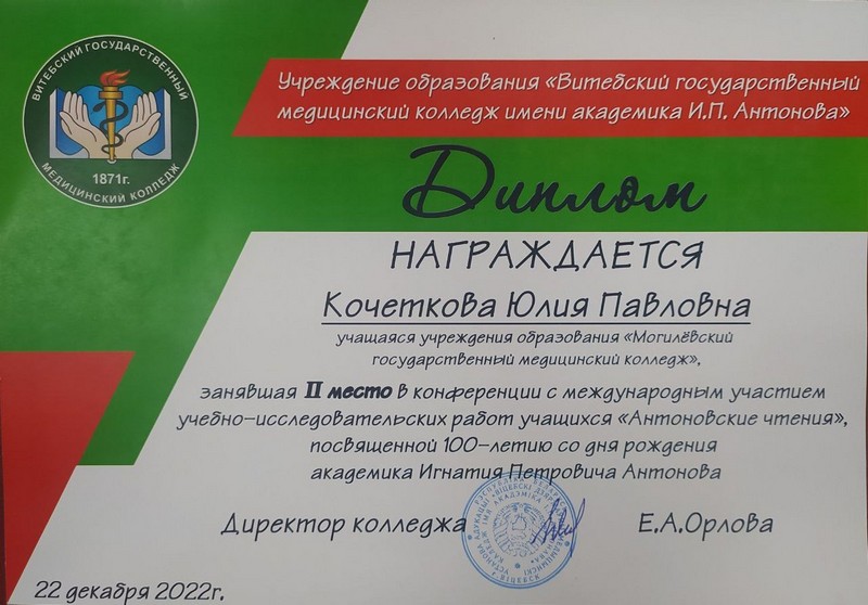 В декабре 2022 года учащаяся группы 4ЛД20 Юлия Кочеткова приняла участие в «Антоновских чтениях» – конференции с международным участием учебно-исследовательских работ, посвященной 100-летию академика Игнатия Петровича Антонова. Мероприятие проводилось на базе учреждения образования «Витебский государственный медицинский колледж имени академика И.П.Антонова». В работе конференции приняли участие 48 ребят из 10 учреждений образования. Работа Юлии – «Памятник памяти: история и современность», памяти пациентов психиатрических больниц Беларуси, уничтоженных фашистами, – заняла достойное 2 место в секции «История медицины. Гуманитарное и естественно научное направление». Поздравляем Юлю с успешным выступлением и заслуженным Дипломом!