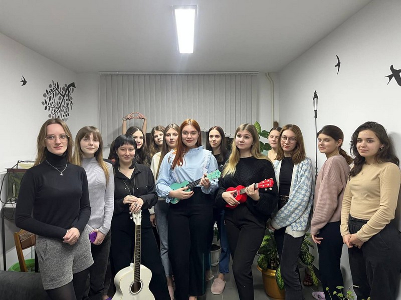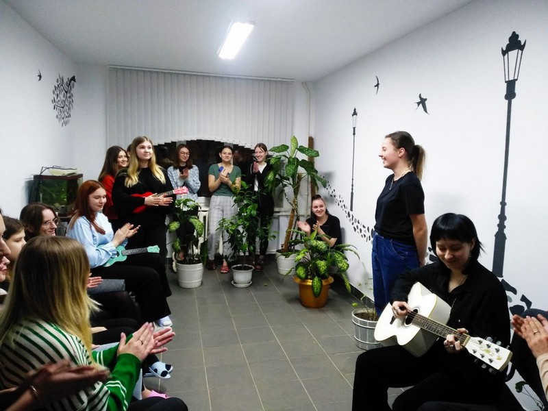 Все с удовольствием слушали Софью Флягину, Валерию Таранович, Ульяну Зенькевич, Яну Корзан, Алену Цапик. Выступающие старались для зрителей, и в награду получали аплодисменты и радость на лицах слушателей. На мероприятии были представлены сольные выступления под гитару или укулеле, исполнение в дуэте, а в заключительной части традиционно дружно пели все вместе, потому что такие встречи всегда интересны, и в нашем общежитии мы чувствуем себя легко и непринужденно.