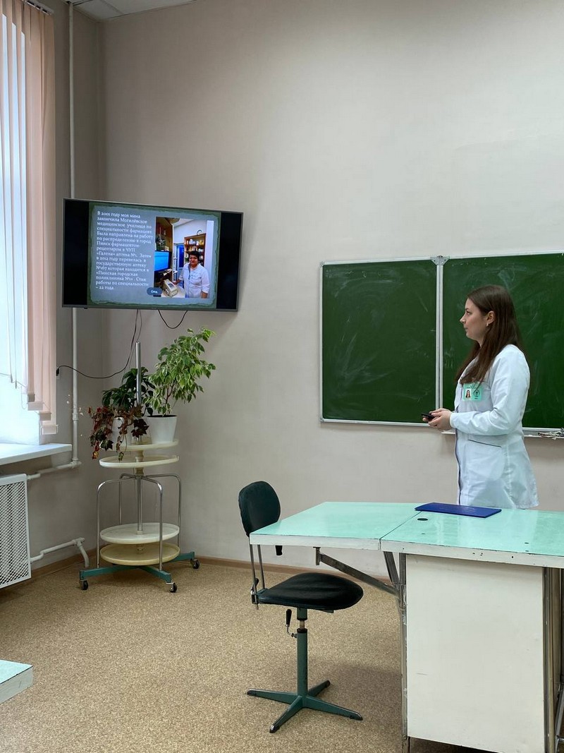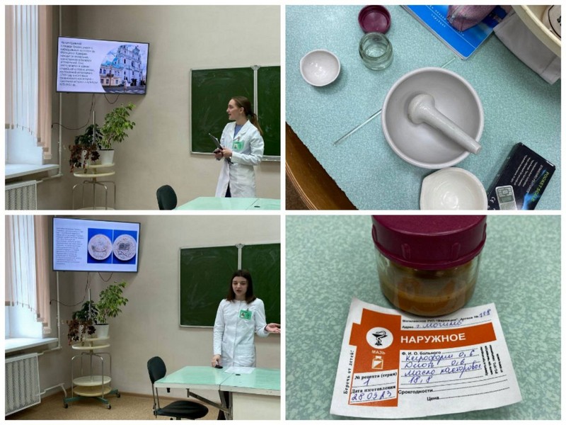 28 марта преподаватели Василенко Г.В. и Минькова Е.Н. провели открытое заседание кружка по учебному предмету «Фармацевтическая технология». Учащаяся группы 1Ф21 Малышко А. представила презентацию об аптеке-музее города Гродно. Учащиеся группы 1Ф21 Кучеренко Д. и группы 5Ф21 Яромич А. представили доклады и презентации на тему «Фармацевт. Взгляд на профессию», в ходе которых рассказали о своих фармацевтических династиях.