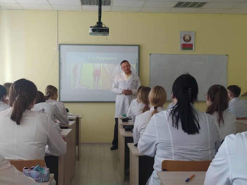 Преподаватель Могилевского медицинского колледжа Иванчиков Николай Владимирович 10 апреля провел открытое учебное занятие в группе 6Ф22 по учебному предмету «Скорая медицинская помощь» на тему «Внезапные состояния. Скорая медицинская помощь при внезапных состояниях». Данная тема имеет большое практическое значение в формировании профессиональных компетенций будущего специалиста – фармацевт должен иметь представление о внезапных состояниях человека (обморок, острый инфаркт миокарда, коллапс, приступ бронхиальной астмы, острый живот, аллергические реакции, гипертермия, судороги, гипогликемия, коматозные состояния). Причины, клинические проявления этих заболеваний могут возникнуть везде. Умение не растеряться, оказать посильную помощь или просто организовать пространство для пострадавшего помогут существенно снизить последствия и быстрее реабилитироваться пострадавшему.