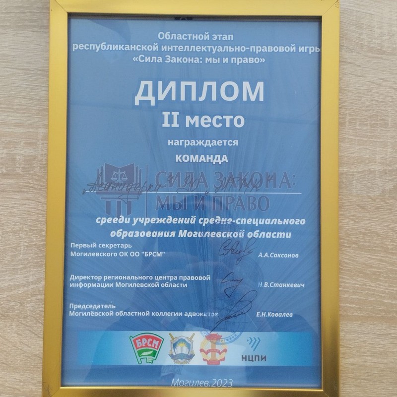 21 апреля 2023 года под эгидой Белорусского Республиканского Союза Молодежи прошел областной этап республиканской интеллектуально-правовой игры «Сила закона: мы и право». Могилевский медицинский колледж представили учащиеся выпускных групп: Асадулаев Илья (группа 2ЛД20), Болотникова Полина (группа 4Ф21), Задерка Ксения (группа 1МДД21), Курневич Денис (группа 1МДД21), Иванов Артем (группа1МДД21).