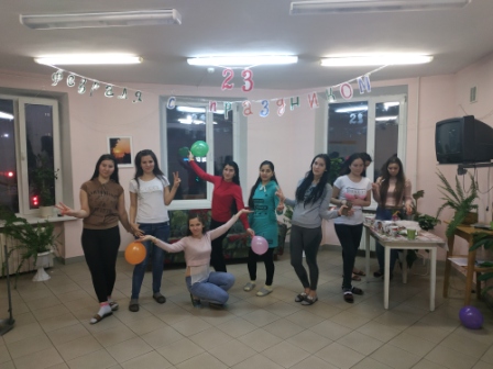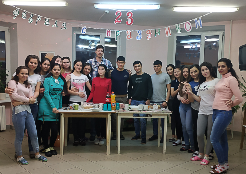 23 февраля, в День защитников Отечества в общежитии №1 прошёл вечер отдыха. Его организовали иностранные учащиеся, проживающие в обоих общежитиях. Девочки продумали подарки к мужскому празднику, украсили фойе, приготовили угощения. Удовольствие от встречи, от собственного креатива - получили все!