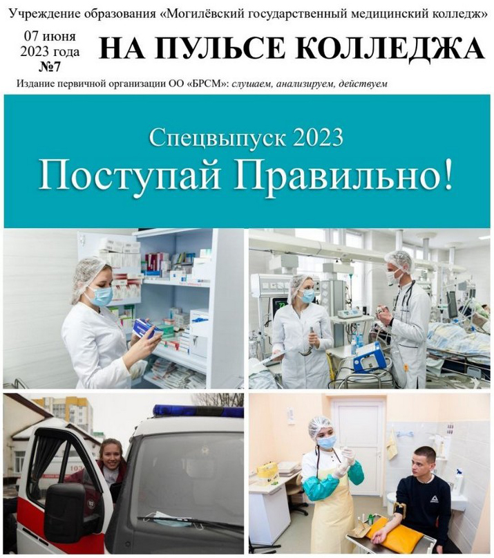 Уже совсем скоро в Могилевском медицинском колледже наступит горячая пора. С 20 июля начнется вступительная компания в учреждениях среднего специального образования. Какую профессию выбрать, чтобы в будущем быть востребованным специалистом? Какая специальность принесет и удовольствие, и финансовое благополучие? Что такое целевая подготовка? Ответы на эти и другие вопросы будущие абитуриенты могут найти в спецвыпуске нашей студенческой газеты «Поступай правильно!».