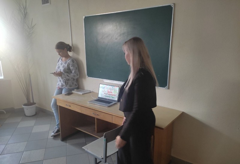 В начале участникам мероприятия была предоставлена для просмотра презентация «17 сентября – День народного единства», подготовленная Козловой Евгенией (группа 2Ф23) и Новик Полиной (группа 7Ф23). Девочки подробно рассказали об истории этого праздника.