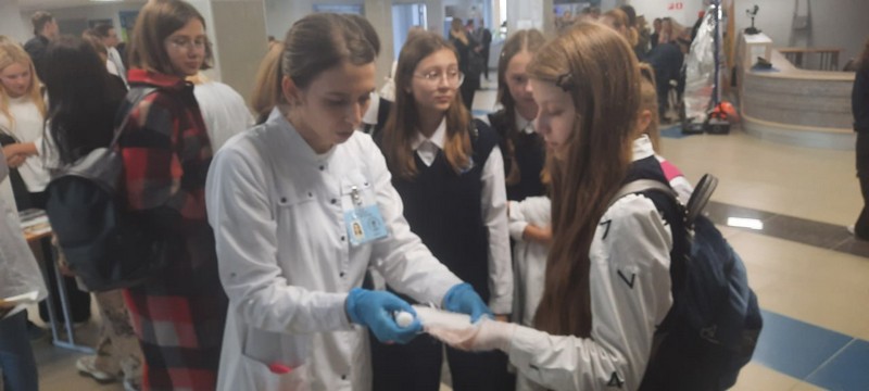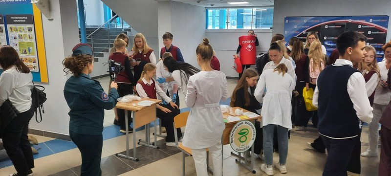 Волонтеры медицинского отделения обучали учащихся школ навыкам доврачебной помощи: наложению повязок, кровоостанавливающего жгута, измерению артериального давления, проведению сердечно-легочной реанимации.