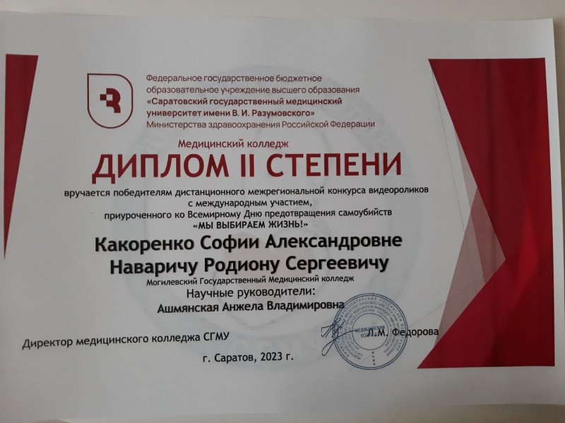 В сентябре 2023 года на базе Саратовского государственного медицинского университета им. В. И. Разумовского проходил дистанционный межрегиональный конкурс видеороликов с международным участием, приуроченный к Всемирному Дню предотвращения самоубийств «Мы выбираем жизнь!».