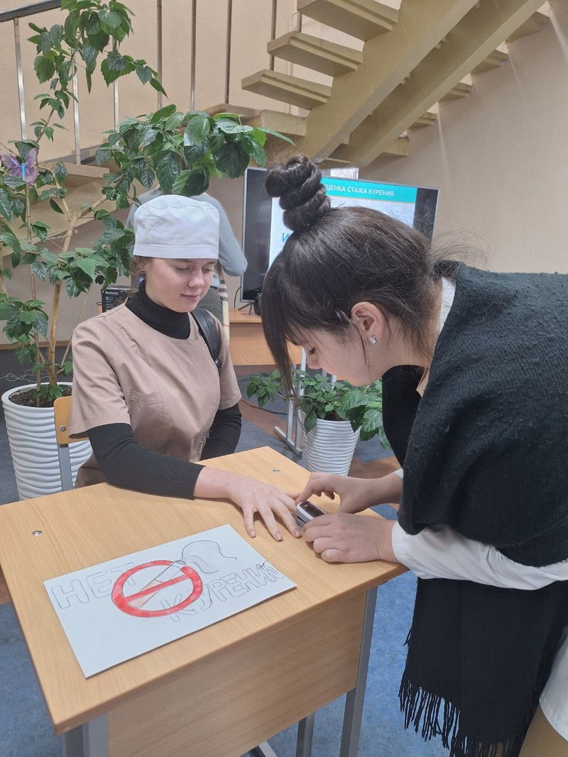пройти мини-обследование у будущих фельдшеров (узнать насыщенность крови кислородом, измерить артериальное давление, пульс, рост, массу тела, измерить индекс массы тела), посмотреть обучающие видеоролики о вреде курения, а также по специальному аппарату узнать о предрасположенности к различным заболеваниям внутренних органов. Размещая на стенде ладони с надписью «Я ПРОТИВ КУРЕНИЯ» учащиеся показывали свое негативное отношение к этой вредной привычке, а взамен получали приятный бонус в виде конфет.