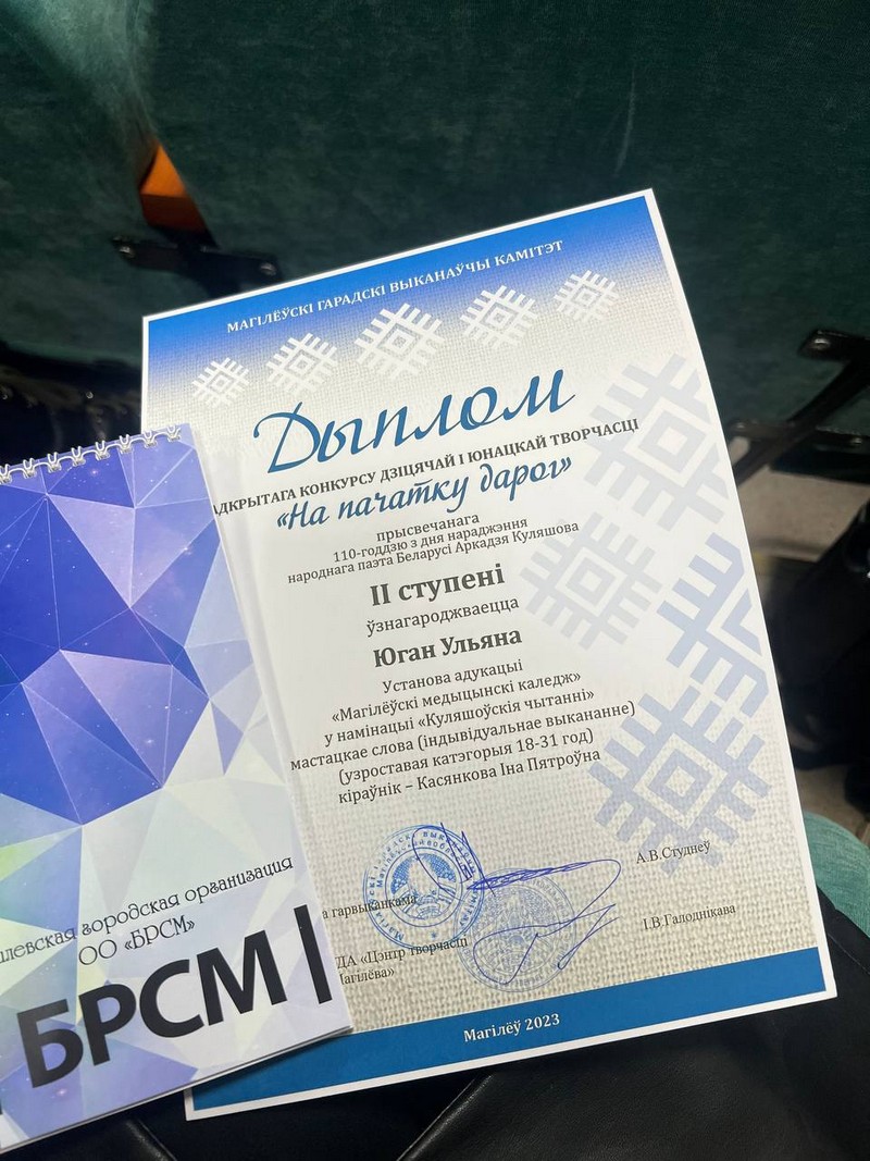 По итогам конкурса 2 место в номинации «Мастацкае слова» в возрастной категории 18-31 лет завоевала учащаяся группы 7Ф23 Юган Ульяна, руководитель Косенкова Инна Петровна.