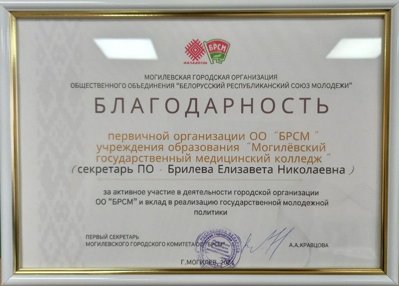 Первичная организация ОО «БРСМ» Могилевского медицинского колледжа отмечена благодарностью за активное участие в деятельности городской организации ОО «БРСМ» и вклад в реализацию государственной молодежной политики.