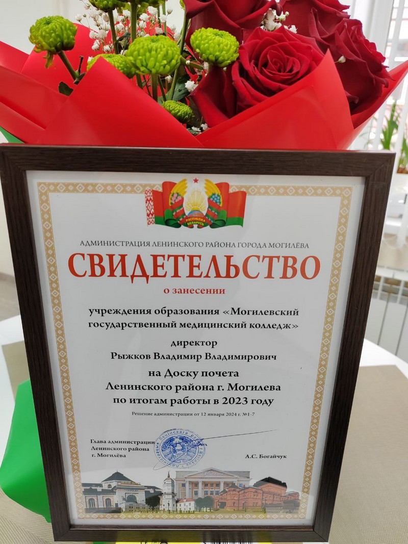 Решением администрации Ленинского района города Могилева учреждение образования «Могилевский государственный медицинский колледж» занесено на Доску почета по итогам работы в 2023 году.