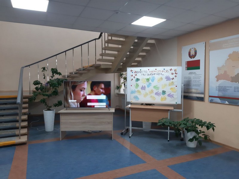 В фойе 4 учебного корпуса в течение дня демонстрировались видеоролики антинаркотической направленности, видеосюжеты о работе волонтеров колледжа на базе Центра профилактики и созидательной активности, о проведении ими тренинговых занятий «Вне зависимости» с учащимися школ города Могилева.