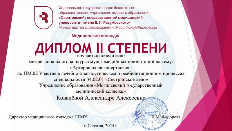 Учащиеся специальности «Сестринское дело» приняли участие в межрегиональном конкурсе мультимедийных презентаций на тему: «Артериальная гипертензия». Конкурс был организован Медицинским колледжем ФГБ ОУ ВО «Саратовский государственный медицинский университет имени В.И.Разумовского».