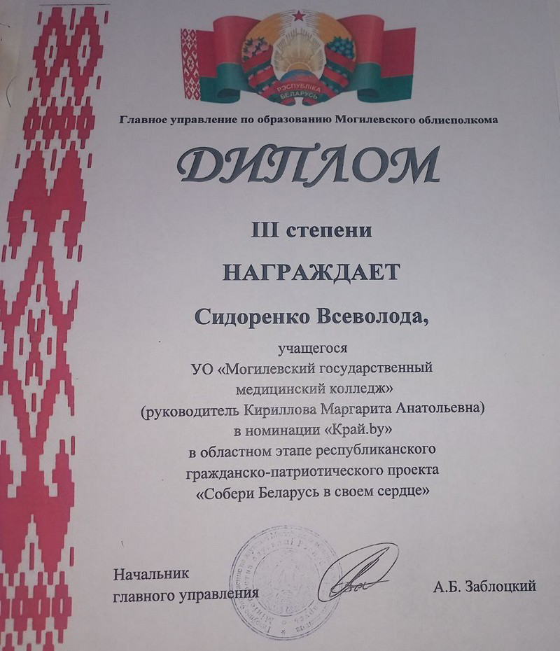 Учащийся Могилевского государственного медицинского колледжа Всеволод Сидоренко выступил в номинации «Край.by» и был награжден Дипломом III степени!