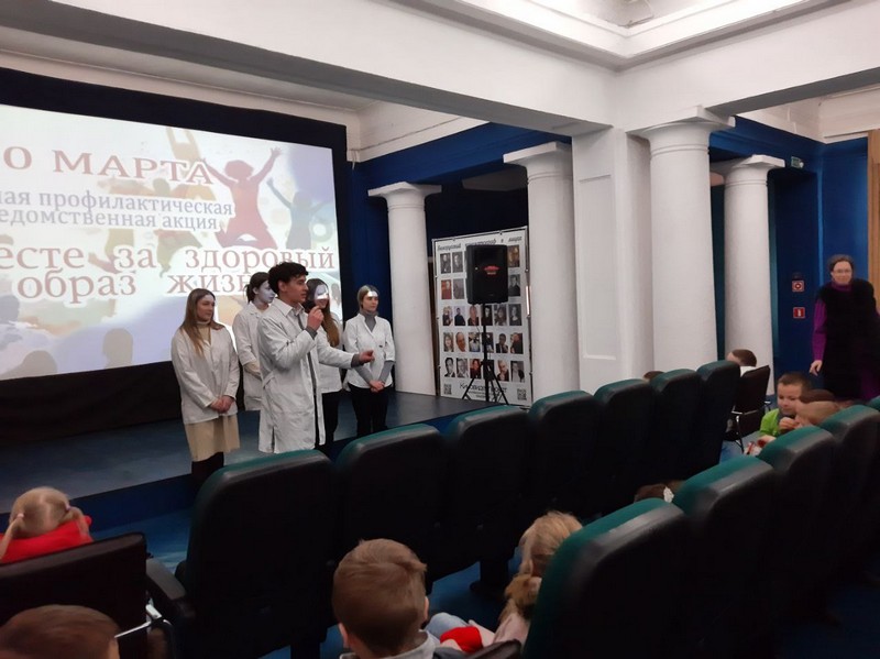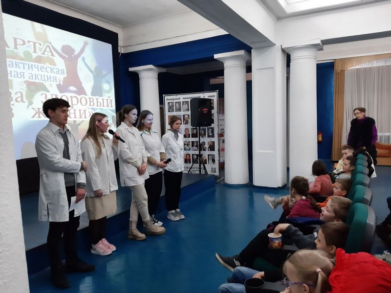 25 марта в кинотеатре «Родина» волонтеры Могилевского медицинского колледжа провели практическое занятие «Будь здоров!» с учащимися школьного лагеря при ГУО «Средняя школа № 22 г. Могилева». Занятие проводилось в рамках областной профилактической межведомственной акции «Вместе за здоровый образ жизни».