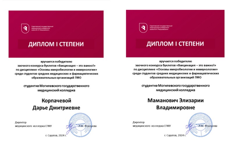 В ноябре 2024 года учащиеся Могилевского медицинского колледжа Дарья Корпачева и Элизария Маманович приняли участие в конкурсе буклетов «Вакцинация – это важно!» по предмету «Основы микробиологии и иммунологии» среди студентов средних медицинских и фармацевтических образовательных учреждений, организованных Медицинским колледжем Саратовского государственного медицинского университета имени В.И. Разумовского, Российская Федерация.