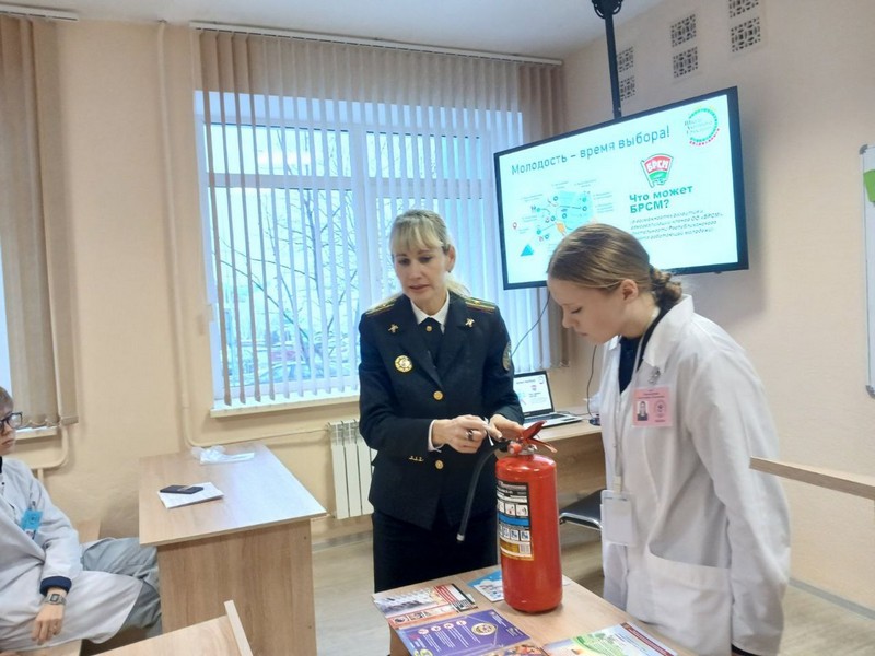 Перед учащимися выступила представитель Белорусского добровольного пожарного общества Радионова Е.В., которая рассказала о мерах по соблюдению пожарной безопасности в быту и во время учебы, о пожарных извещателях, первичных средствах тушения пожаров, показала как пользоваться огнетушителем.