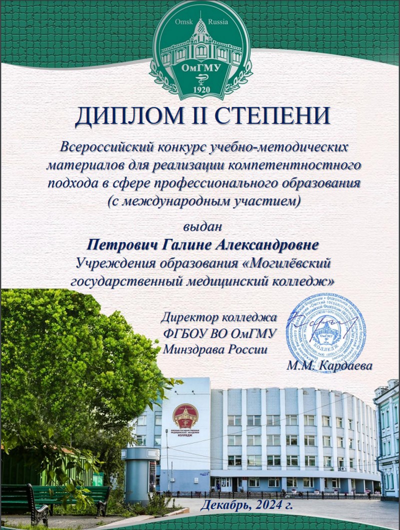Преподаватель Могилевского медицинского колледжа Петрович Галина Александровна приняла участие во Всероссийском конкурсе учебно-методических материалов для реализации компетентностного подхода в сфере профессионального образования (с международным участием), который прошел на базе медицинского колледжа Омского государственного университета.