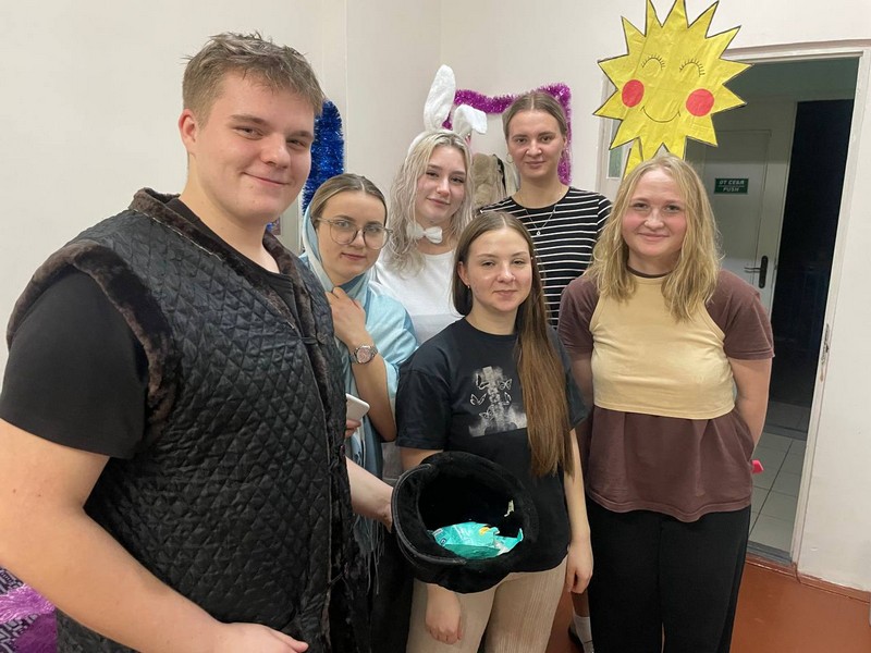 В целях знакомства с древними народными праздниками, обычаями и обрядами группа ребят общежития решила выступить в роли массовиков-затейников. В компании ряженых были традиционные колядные персонажи –Баба Яга, Заяц, Баба, Дед и Зорька. Со словами «Сеем, сеем, счастье посеваем, с Рождеством всех поздравляем! Пусть румяными будут щеки, бодрым тело и счастливым сердце!» совершили обход комнат общежития, исполнили колядные присказки, поиграли в народные игры, наградили жильцов щедрыми пожеланиями доброго здоровья, счастья и удачи в наступившем году.