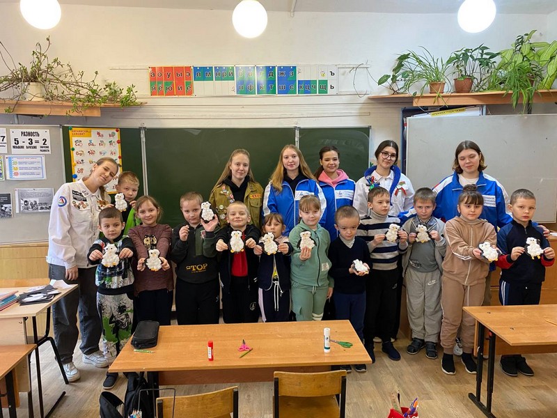 Вначале отряд отправился в Жирятинскую СОШ имени Героя Советского Союза А.Ф. Возликова, где бойцы провели мастер-классы для младших школьников по изготовлению «полярных сердец» из фетра и веселые старты «Вперед к Победе».