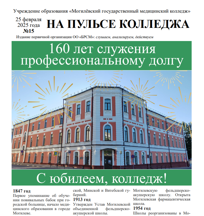 Дорогие друзья! 25 февраля Могилевский медицинский колледж отмечает свое 160-летие. О том, чего достигли и что еще впереди, о талантливых преподавателях, именитых выпускниках и актуальных событиях из жизни учащихся и не только читайте в праздничном выпуске студенческой газеты «На пульсе колледжа».