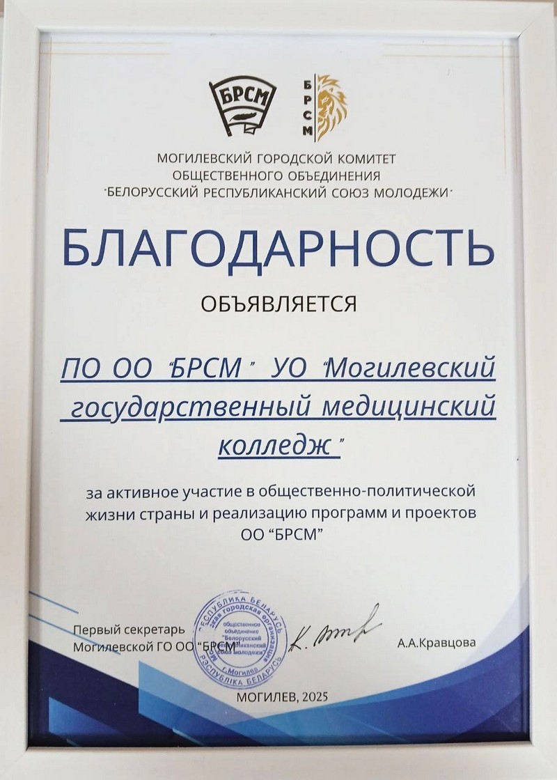 Первичной организации ОО «БРСМ» учреждения образования «Могилевский государственный медицинский колледж» объявлена благодарность за активное участие в общественно-политической жизни страны и реализацию программ и проектов ОО «БРСМ».