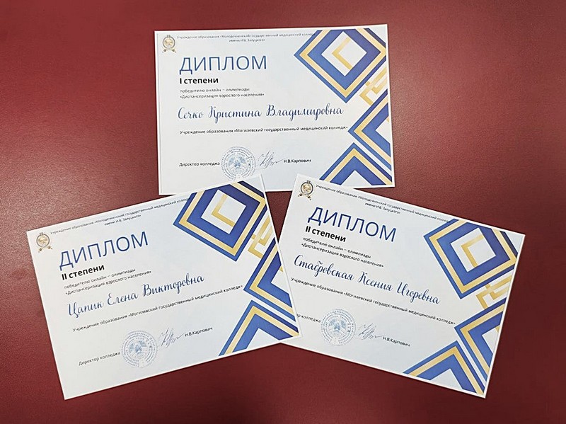 Учащиеся Могилевского медицинского колледжа 12 февраля успешно приняли участие в онлайн-олимпиаде «Диспансеризация взрослого населения» среди обучающихся выпускных курсов специальности «Лечебное дело», которая была организована на базе учреждения образования «Молодечненский государственный медицинский колледж имени И.В. Залуцкого».