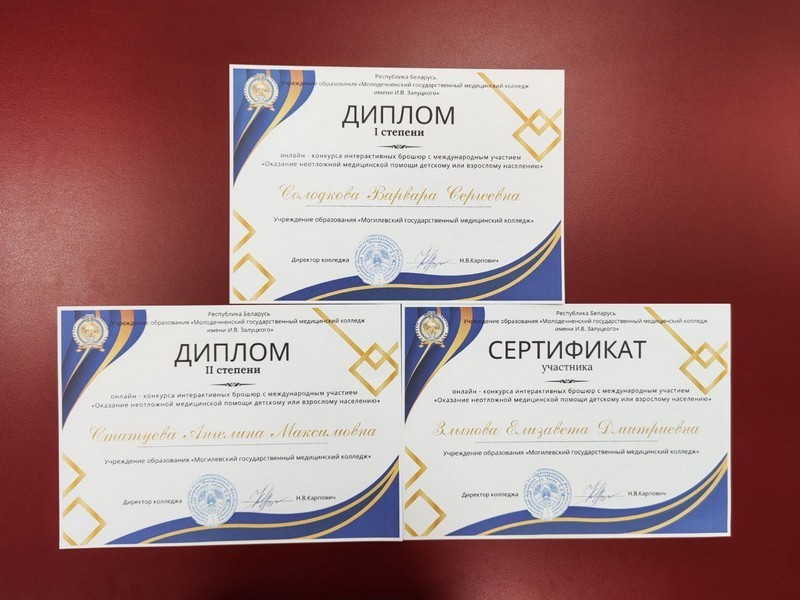 А 28 февраля были подведены итоги онлайн-конкурса интерактивных брошюр с международным участием по теме «Оказание неотложной медицинской помощи детскому или взрослому населению» для учащихся специальности «Лечебное дело», который также был организован Молодечненским медицинским колледжем. Наши учащиеся показали отличный результат!