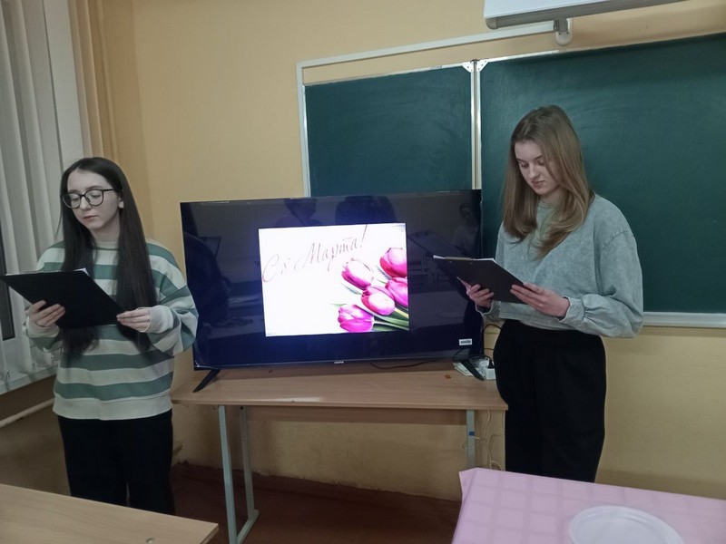 Праздничный вечер начался с Гимна женщине В. Брюсова. Ведущие Виктория Печень и Мария Лапотко читали стихи И. Анненского, А. Дементьева, Р. Гамзатова, звучала музыка Е. Доги, П. Чайковского, Л. Бетховена.