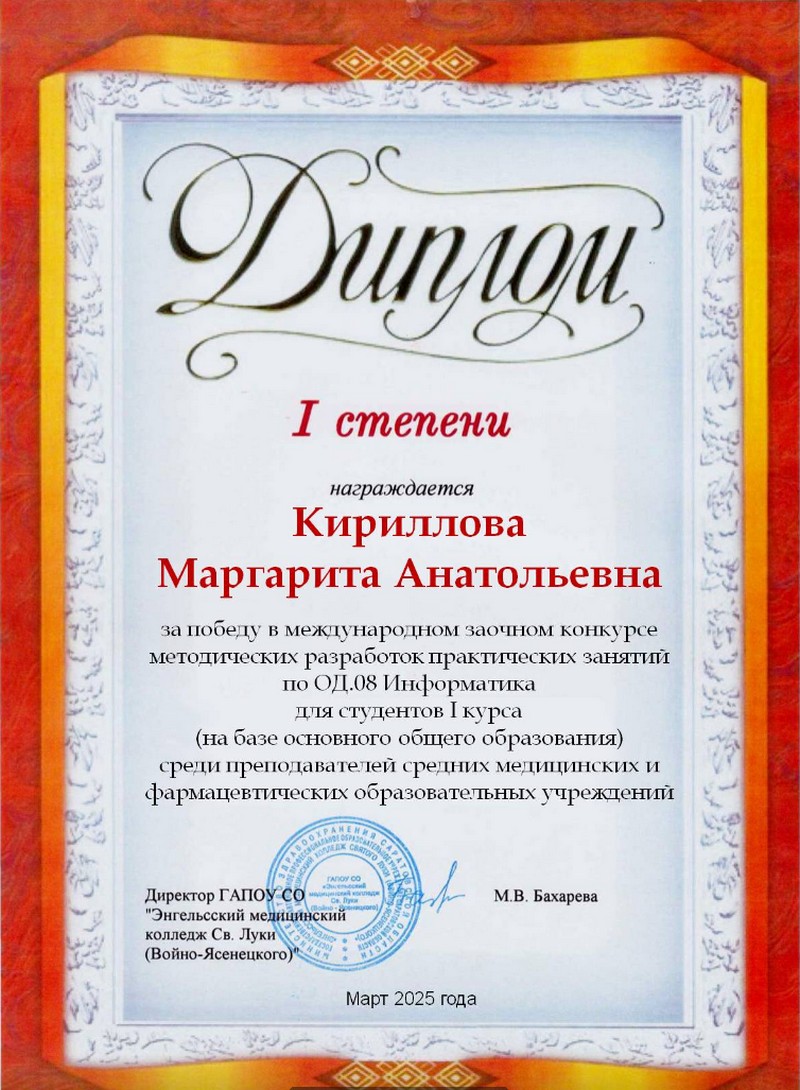 Преподаватель Могилевского медицинского колледжа Кириллова Маргарита Анатольевна приняла участие в конкурсе методических разработок практических занятий по ОД.08 Информатика для студентов I курса среди преподавателей средних медицинских и фармацевтических образовательных учреждений, который прошел на базе ГАПОУ СО «Энгельсский медицинский колледж Св. Луки (Войно-Ясенецкого)».