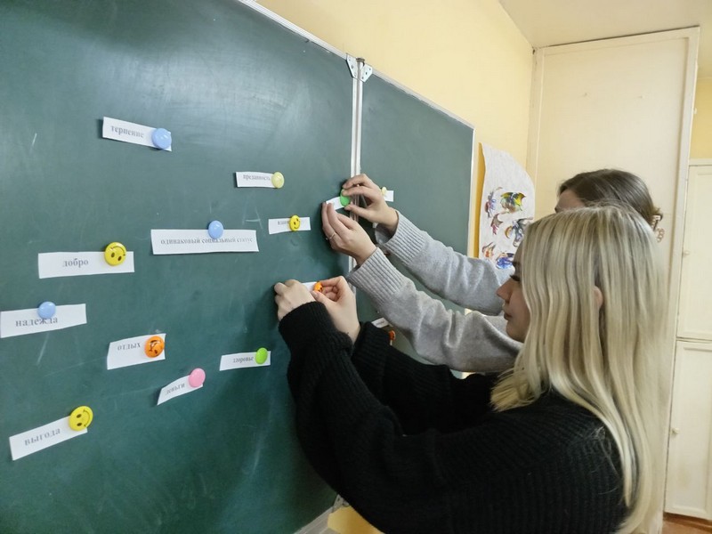 Присутствующие ответили, какие ассоциации возникают со словом «семья» и на доске построили свою модель идеальной семьи из предложенных карточек с различными качествами, составили из словесной мозаики пословицы о семье.