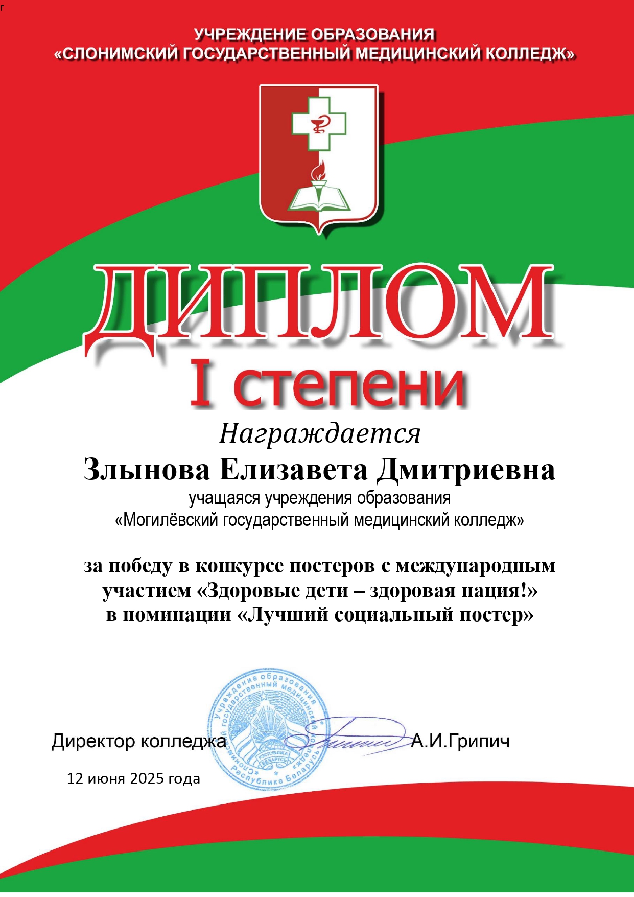 Мы гордимся, что работа учащейся Могилевского медицинского колледжа Злыновой Елизаветы, группа 1ЛД23, была удостоена диплома I степени в номинации «Лучший социальный постер»!