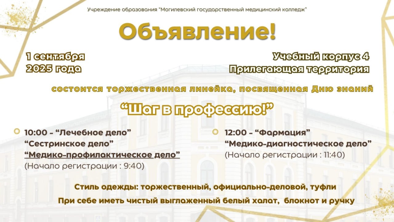 Учащиеся нового набора по специальностям: Фармация, Медико-диагностическое дело приглашаются на торжественное мероприятие, посвященное Дню знаний 1 сентября в 12:00 (регистрация в 11:40).