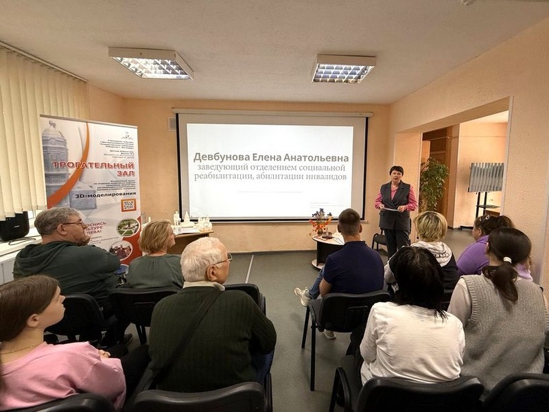 Заведующий отделением социальной реабилитации, абилитации инвалидов Девбунова Елена Анатольевна познакомила участников с деятельностью учреждения и поделилась опытом работы с людьми, имеющими нарушения зрения.