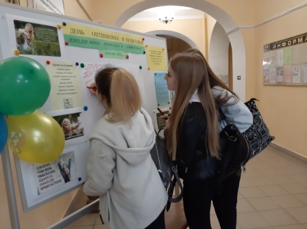 С пожеланиями доброго утра и хорошего дня при входе в учебные корпуса всех встречали учащиеся 2 курса и дарили позитивные пожелания – предсказания, предлагали на красочно оформленном стенде дописать продолжение фразы «Жизнь прекрасна и удивительна, потому что…».