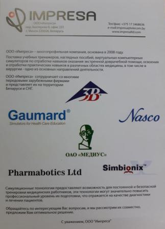 Оборудование поставлено компанией ООО «Импреса», которая сотрудничает со многими передовыми зарубежными фирмами и представляет их в Республике Беларусь и странах СНГ. Благодаря занятиям с использованием симуляционных технологий улучшаются моторные навыки учащихся, движения становятся четкими и уверенными, повышается профессиональный уровень подготовки, что отражается на качестве диагностики и лечения пациентов.