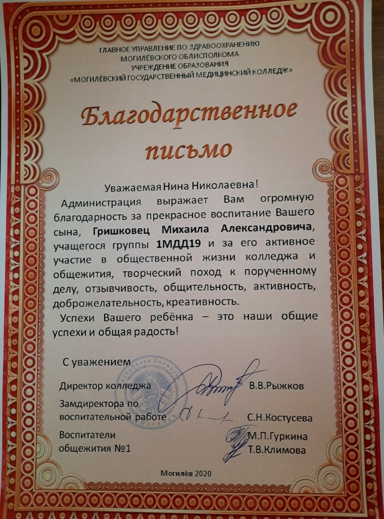 А также от имени администрации колледжа мамам самых активных учащихся, проживающих в общежитии № 1, были вручены благодарственные письма.