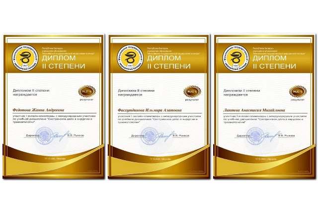 17 декабря на платформе MOODLE была проведена онлайн-олимпиада с международным участием по учебной дисциплине «Сестринское дело в хирургии и травматологии» среди учащихся учреждений среднего специального образования по профилю «Здравоохранение». В олимпиаде приняло участие 75 человек из Республики Беларусь и Российской Федерации. Задания для олимпиады разработали преподаватели Дроздова Н. В. и Парфенова Н. Н.