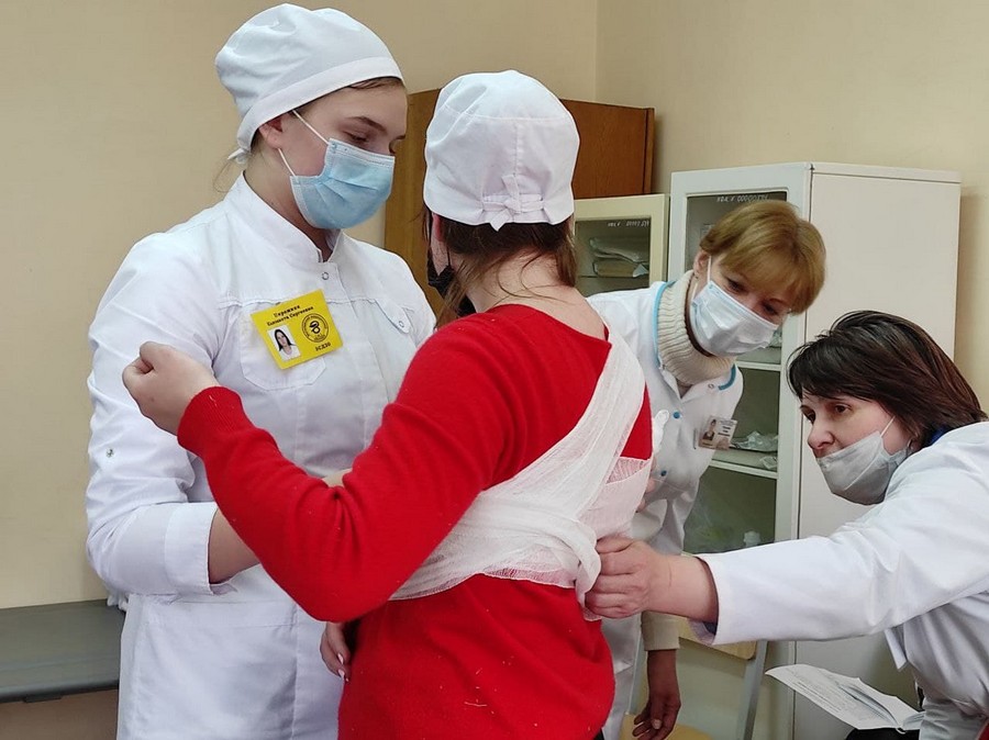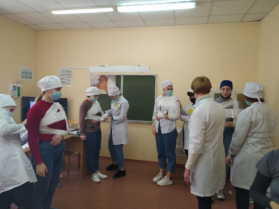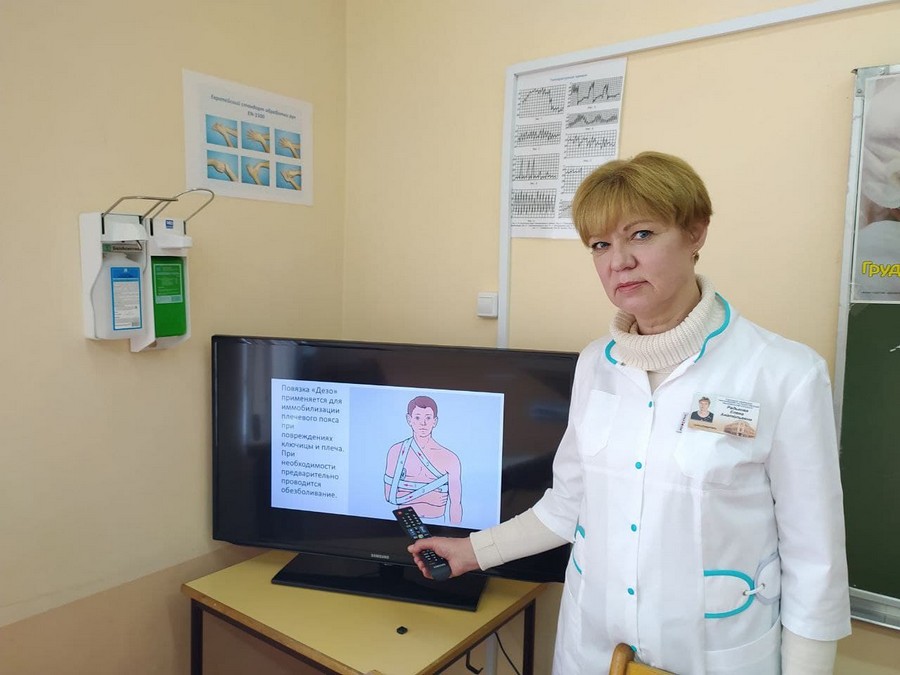 Во время данного практического занятия будущие медицинские сестры повторили необходимый теоретический материал и научились накладывать повязку на туловище «Дезо», спиральную повязку на грудную клетку, колосовидную повязку на плечевой сустав, а также проверили свои знания с помощью системы электронного обучения Moodle. Преподаватель продемонстрировала коллегам методику организации работы учащихся в парах, применяемую для развития самостоятельности учащихся в процессе взаимоконтроля и самоконтроля.