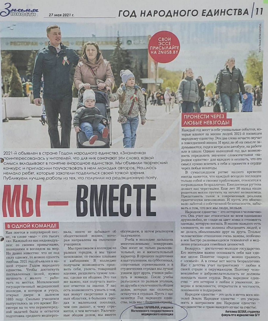 2021 год объявлен в стране Годом народного единства. Общеполитическая молодежная газета «Знамя юности» в марте пригласила креативную и талантливую молодежь Беларуси поучаствовать в творческом конкурсе: поразмышлять о том, что означают слова «народное единство» и написать об этом эссе.