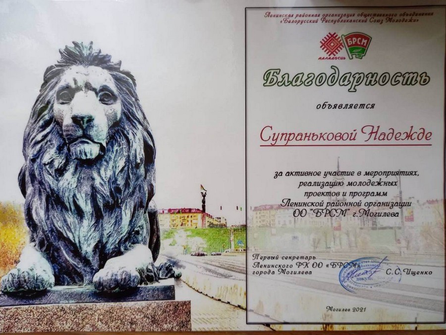В этот же день пять активистов ПО ОО «БРСМ» нашего колледжа приняли участие в открытом диалоге «Сэрцам адданыя роднай зямлі», который проходил в Могилевском экономическом профессионально-техническом колледже. Учащимся группы 4ЛД20 Надежде Супраньковой и Анастасии Хлыстиковой была объявлена благодарность и вручены билеты в кинотеатр за активное участие в мероприятиях, реализацию молодежных проектов и программ Ленинской районной организации ОО «БРСМ».