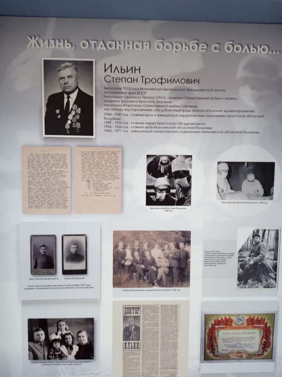 В ходе экскурсии учащиеся познакомились с биографией Степана Трофимовича, узнали, что он – выпускник 1913 года Могилевской фельдшерской школы, заслуженный врач БССР, легендарный военврач, награжден орденами Ленина, Отечественной войны 1-ой степени, Трудового Красного Знамени, медалями. В 1955 году Степан Трофимович был назначен главным хирургом Могилевского областного отдела здравоохранения, а в 1956 году – главным врачом Могилевской областной больницы, в восстановление и развитие которой он внес большой вклад.